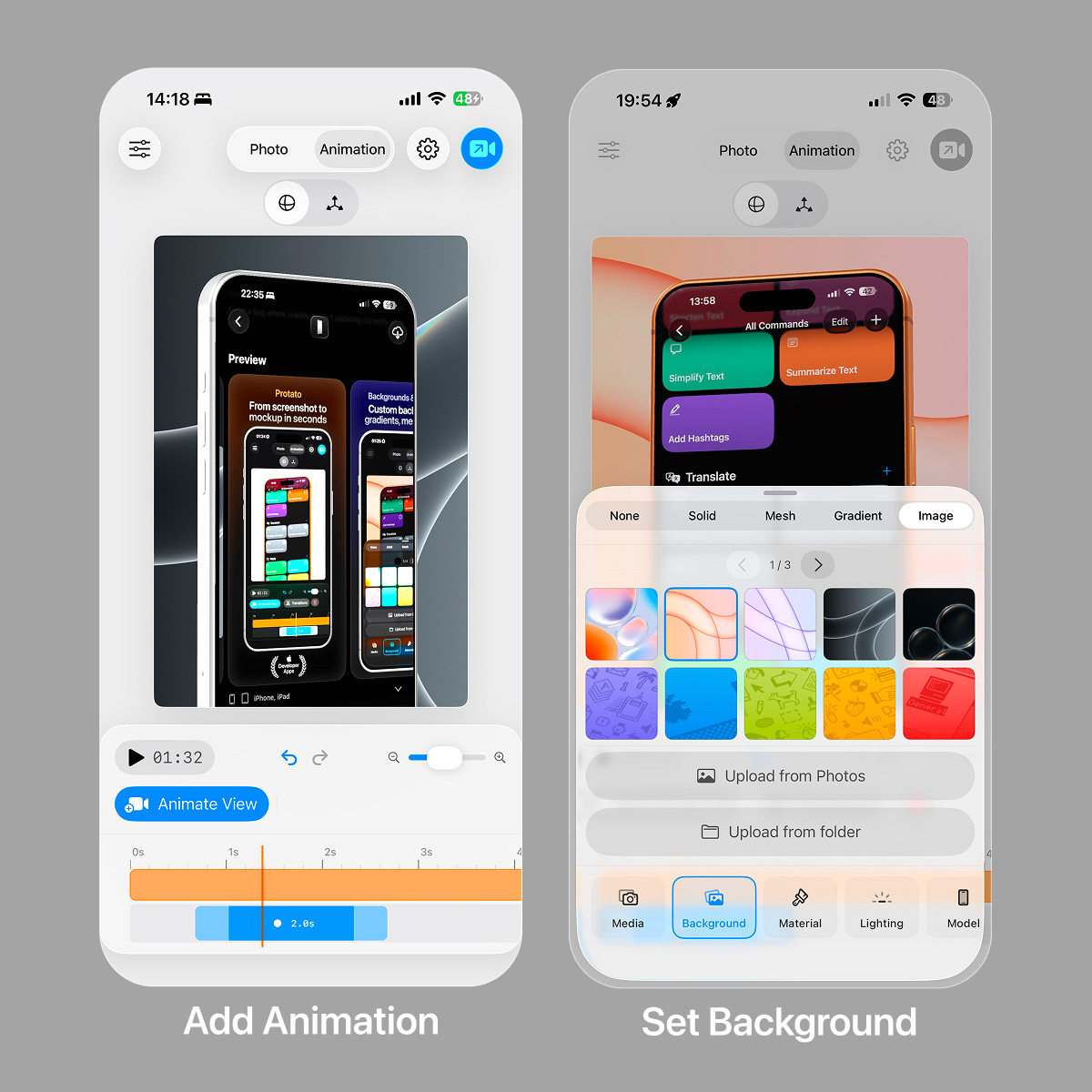 Your phone is now in 3D space with realistic lighting, but the background matters too. A solid color (like a brand color) keeps the focus on the phone. A gradient adds subtle depth. A custom image can match your app's aesthetic. Or make it transparent and overlay on top of your other marketing materials.