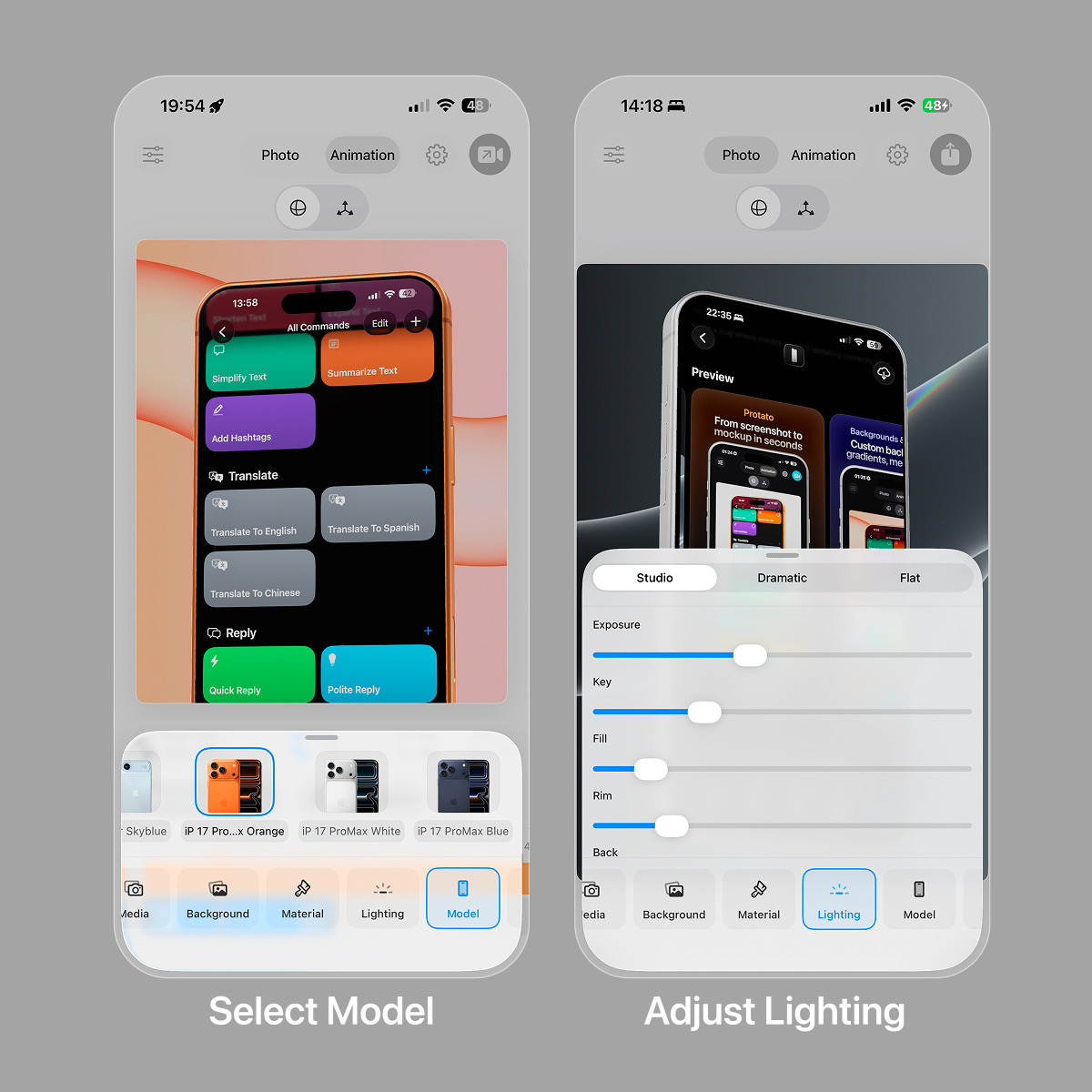 - Choose from three lighting presets—Studio, Dramatic, or Flat